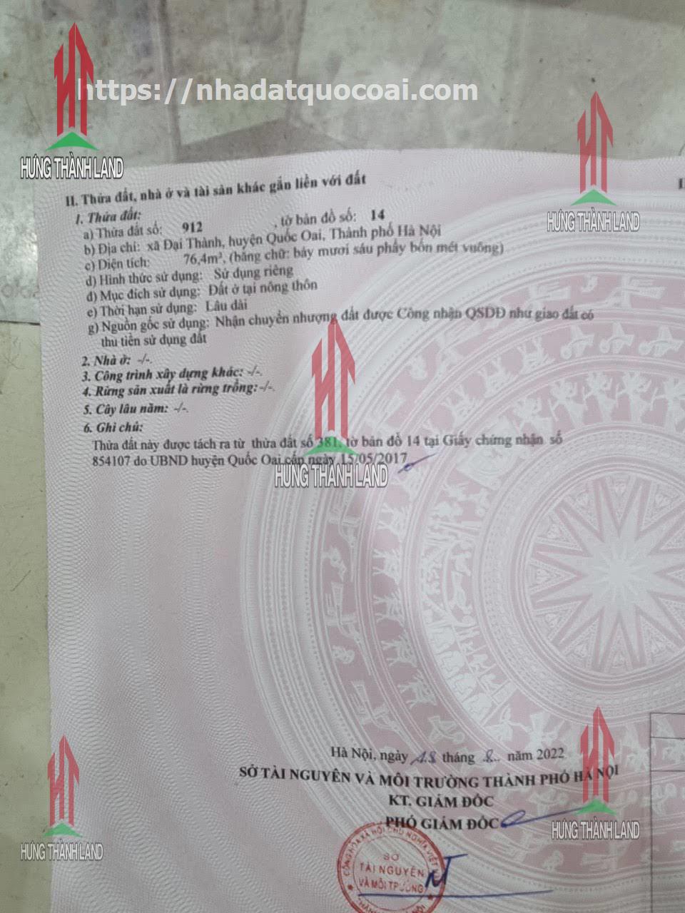 Bất Động Sản Hưng Thành Land bán lô đất ở ĐẠI THÀNH - QUỐC OAI - HN